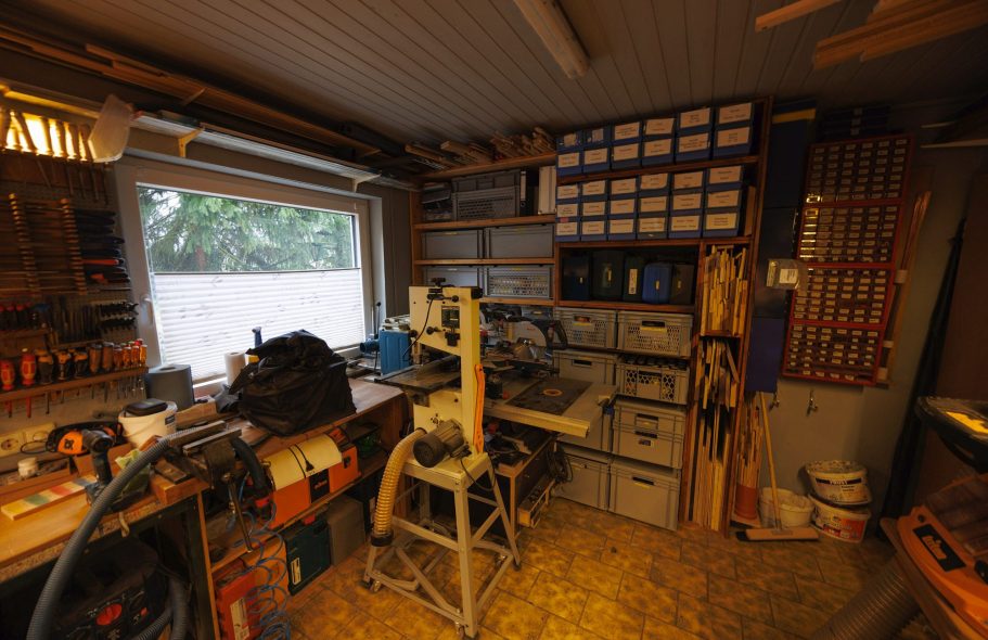 Wie schon angedeutet muss in einer kleinen Werkstatt Manches fahrbar sein. In meinem Fall Bandsäge, Kreissäge und Dickenhobel. Bei Bedarf dürfen diese Teile in die Mitte der Werkstatt rücken. Andere Dinge sind einfach in Schränken oder Regalen verstaut.