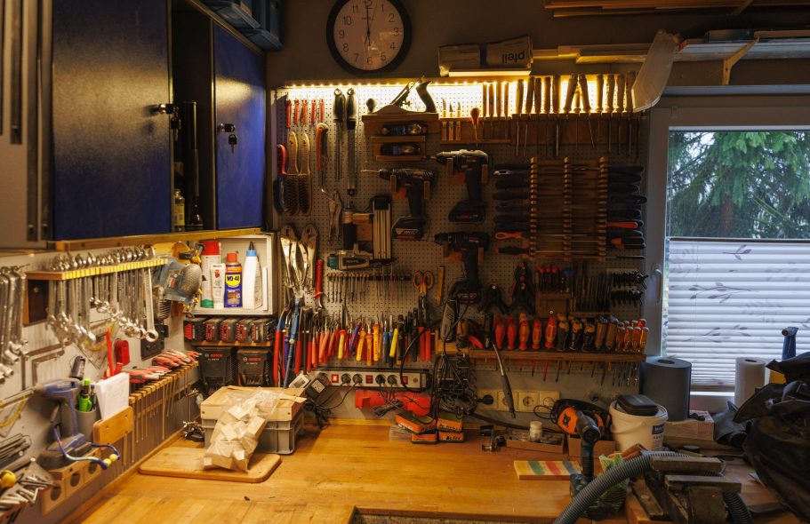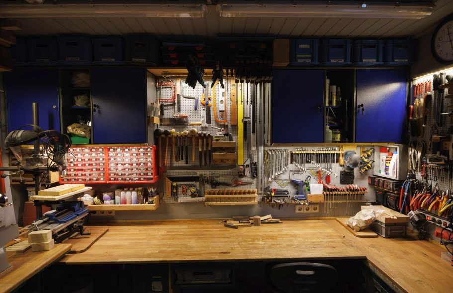 Die U-förmige Werkbank ist das Herz der Werkstatt - vom mittleren Platz aus ist alles Nötige in Griffweite an den Wänden befestigt. Hier ist auch genau der Platz an dem die meisten Werke entstehen, auf jeden Fall aber das letzte Finish.