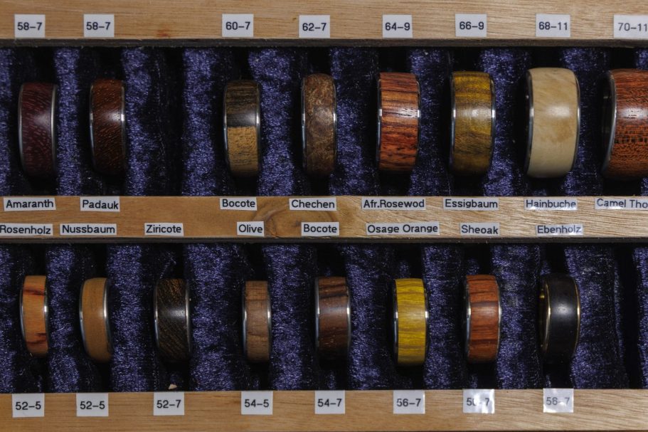 Ringe aus Edelstahl mit Holzeinlage, jedes Stück ein Unikat - wählen Sie Ihr Wunschholz.